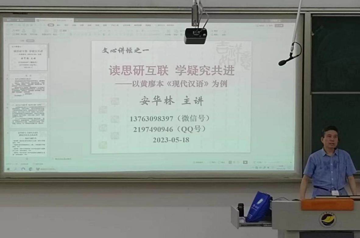 安华林教授以《读思研互联 学疑究共进》为题,从读书要具有思考能力、探究精神出发,基于专业基础课《现代汉语》,结合自身多年的教学科研经验,分别就关于普通话标准的探讨,关于《汉语拼音方案》优化的探讨,关于现代汉语语素的探讨,关于多义词义位的探讨,关于语法单位分级的探讨,关于现代汉语句型划分的探讨等六个实例,用深入浅出、幽默风趣的语言循循善诱,告诫同学们“不迷信教材,不迷信老师,不迷信权威”“学则疑,疑则究”“读而不思无我,思而不研无果”等道理。