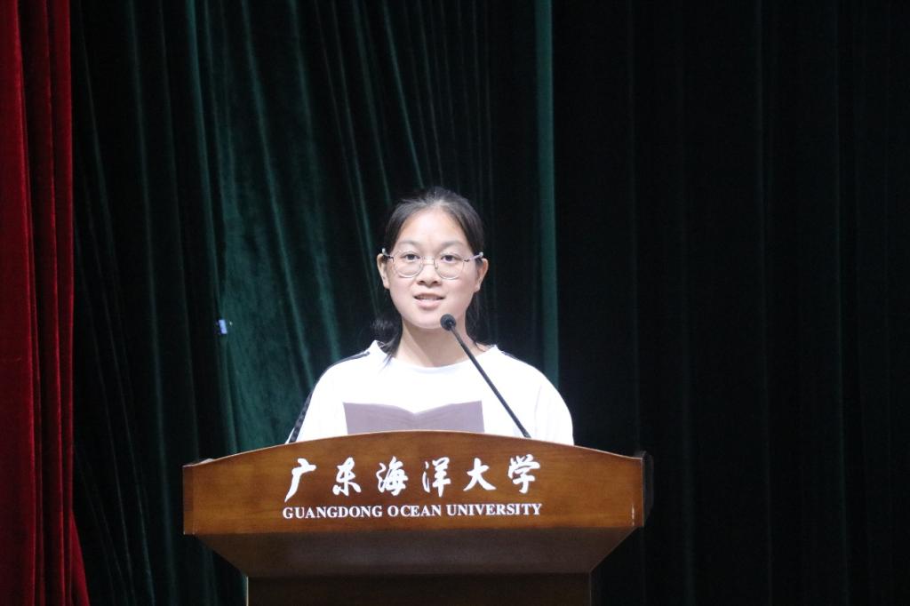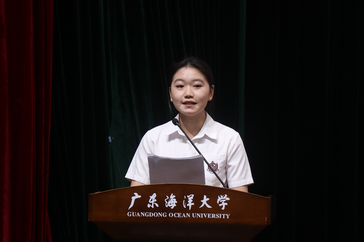 梁嘉怡同学代表新生表示,将在未来四年的老员工活中“秉承“广学明德,海纳厚为”的校训与“文心经世,日新其格”的院训,以高度热情的学习态度,乐观勇敢的生活心态,强国有我的责任担当,抓住机遇,迎接挑战,追求卓越,超越自我,在知识的曙光下追赶时代的光辉,在历史的使命中追随党的步伐,助中华复兴之梦辉煌灿烂!