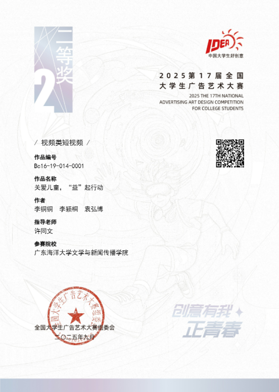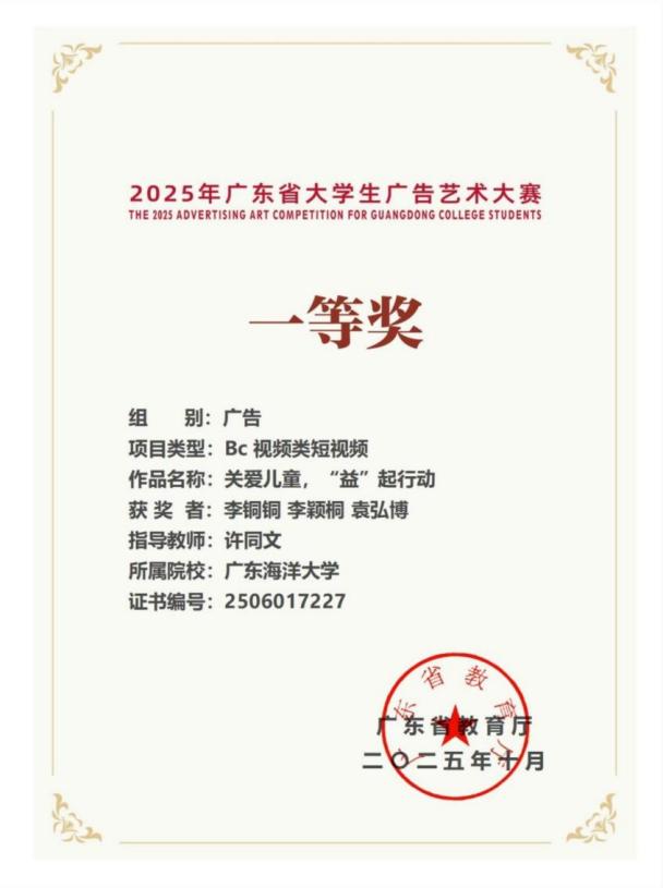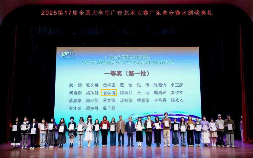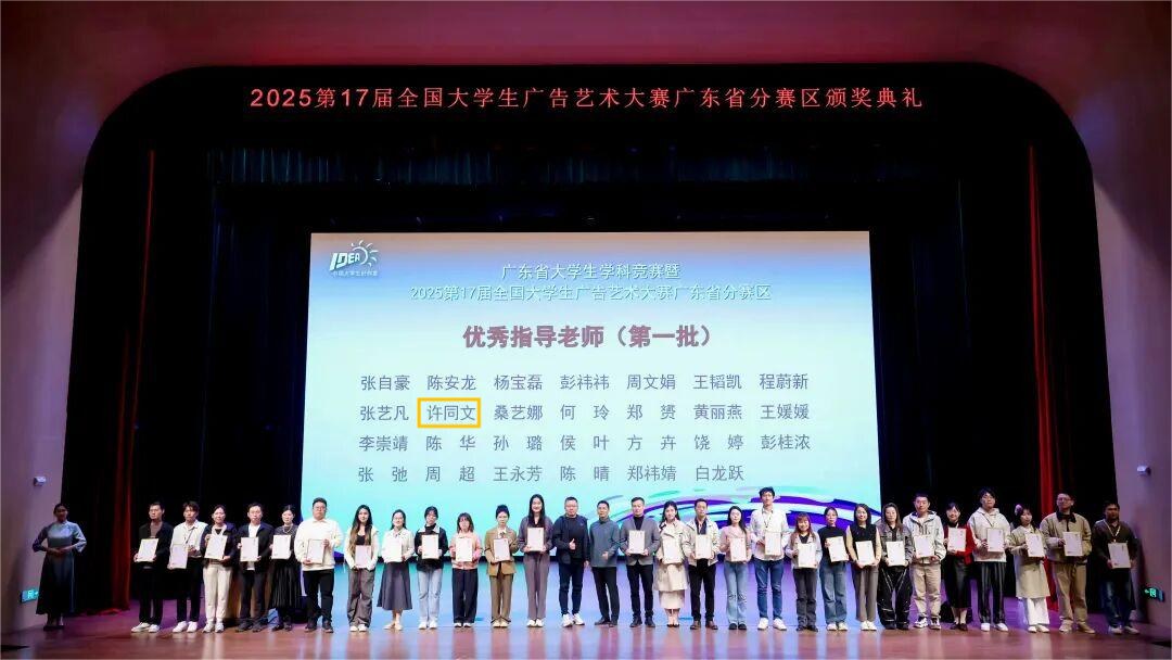 11月22日,第17届全国老员工广告艺术大赛(以下简称大广赛)广东赛区颁奖总结交流活动在广州商公司举行。yl6809永利共获一等奖1项、二等奖1项、三等奖2项。其中,李铜铜、李颖桐、袁弘博的作品《关爱儿童,“益”起行动》荣获省级一等奖、国家级二等奖。许同文老师被广东省教育厅评为“优秀指导教师”。