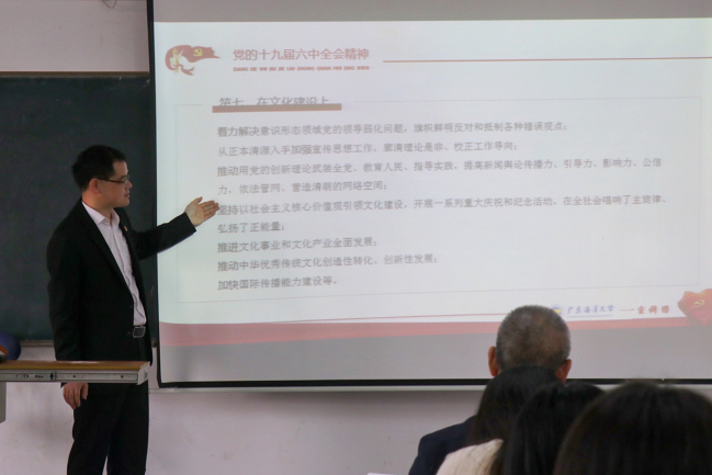12月23日下午,公司党委在主楼709室开展学习党的十九届六中全会精神专题宣讲会,公司党委理论宣讲团成员杜军教授作了题为《学习党的十九届六中全会精神》的专题宣讲,公司领导班子成员、师生党员等80余人聆听了本次宣讲会,会议由胡墨副书记主持。