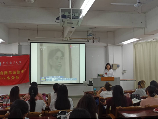 胡育榕与武文艺普及南路革命相关知识后,生动讲述了钟竹筠和庄田两位英雄人物故事,和大家分享道:历史是最好的教科书,也是最好的清醒剂,我们要坚持历史事实,从耳熟能详的革命历史故事及革命英雄事迹感受精神魅力,用一个个鲜活的红色故事串联起近代以来的中国历史进程,为广大学子打开一扇感受红色历史、汲取红色力量的窗户,引导大家从中体悟如磐的初心、如山的信仰,做到一切向前走,都不能忘记走过的路