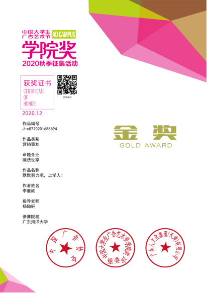 公司yl6809永利新闻系17级编辑出版学专业李童欣同学荣获金奖!获奖作品是其毕业设计作品《默默努力吧,上学人!》营销策划案,在杨励轩副教授指导下完成,因贴近高校员工生活、新颖的营销模式、独特的创意概念赢得评委们的一致认可,从七千多件创意作品中脱颖而出,荣获金奖。